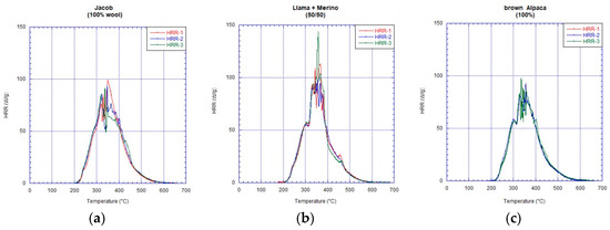 Results from MCC testing of the fibers are shown in Table 1, along with a polystyrene standard for comparison. This particular test measures the inherent heat release for each yarn, and has been used previously to study the heat release of animal and plant fibers [1,15,16,17]. The results for the fibers studied in this work show that for wool and camelid/wool blends, the results were quite similar. However, for the 100% Alpaca fiber, notably smaller values for peak heat release rate (HRR) values and total Heat Release (HR), along with an increase in char yield, were measured. Also present in the table, is heat of complete combustion, which was calculated by dividing the total heat release by 1-measured char yield [18]. Based upon the calculated values in Table 1, the heat of complete combustion results were effectively the same regardless of fiber type. Overall, there are some minor differences in the fibers, with the 100% Alpaca fiber showing somewhat better heat release performance than the other fibers, but other than this minor difference, the fibers are effectively the same as measured by MCC.
