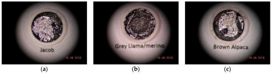 Recent work has found that, in regard to flammability, animal fibers tend to show similar behavior at the milligram scale in that they melt and char, although some differences can be seen among fibers from different animal species (sheep, goat, camel, rabbit, etc.) [1]. While the chemical structure of most protein-based fibers from animals has some definite similarity [2], the fibers clearly differ between species in regard to physical structure. These differences in physical structure often translate into clear visual and textural differences (also known as “hand”) when these fibers are spun into textiles. Differences in fibers between animal breeds of the same species also exist, with different sheep producing wool of greatly different visual and textural properties [3,4]. It can be assumed that the fibers produced from the same species, but different breeds, will be the same chemically, and yet they can have greatly different visual and textural properties. These textural properties could translate into flammability differences between fibers from different breeds of the same species, or they may not be significantly different. The purpose of this study was to determine if the fibers are, for all practical purposes, the same in regard to flammability, even with different breeds, or if they are different, and if different why they are different. Finding animal fibers as a function of breed per species, however, is not an easy task due to how animal fibers are typically consumed for textile use.