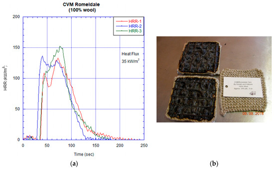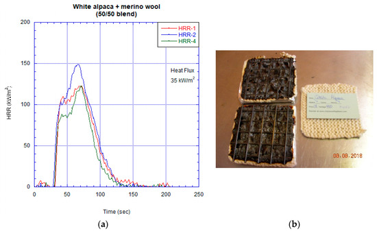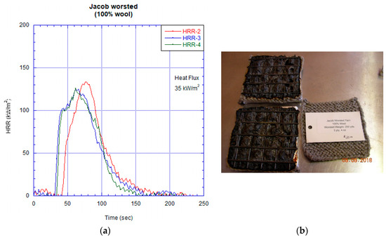 Cone calorimeter is a larger scale heat release test when compared to the MCC. Like the MCC, it measures the inherent heat release of materials, but as a function of sample thickness, geometries, and construction. It has successfully been used to study the heat release of textiles [19,20,21], but not hand-knit textiles. Cone calorimeter may observe some heat release differences as a function of knitted density, since each of the animal fibers knit up differently, especially those of slightly different weight (worsted vs. sport weight).