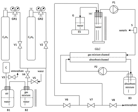 The experiments were carried out as follows: reservoir B3 was filled with water through valve V5 until water appeared in reservoir B2. After that, the outlet pressure of gas reducers GR1 and GR2 (model RPA1, Hy-Lok Corporation, Busan, Korea) was preset to 0.5 bar. A calculated amount of ethylene was brought into reservoir B2 using valves V1 and V4, and the respective volume of water passed from reservoir B2 to reservoir B1. Then, peristaltic pump P1 was turned off and valve V8 was closed, followed by the opening of valves V4 and V6, in order to put the preset volume of the gas mixture into measuring cylinder MC, using compressor C Schego Optimal (Schego, Leipzig, Germany). After that, the compressor C was turned off and valves V4 and V6 were closed. To blow down the gas channel of the contactor (GLC) with the gas mixture from measuring cylinder MC, valve V8 was opened and the peristaltic pump was turned on. After several (3–4) repeating cycles of blow down, valves V6 and V8 were closed, valve V7 was opened, and peristaltic pumps P1 and P2 were turned on. During the whole time of experiments, chromatographic samples were regularly collected from sampler S with simultaneous measuring of decreasing weight of water in glass G, according to the readings of electronic scales ES (model LN420 2CE, Vibra, Moscow, Russia)—in other words, the decrease of gas mixture volume in gas channel of the contactor GLC was measured.