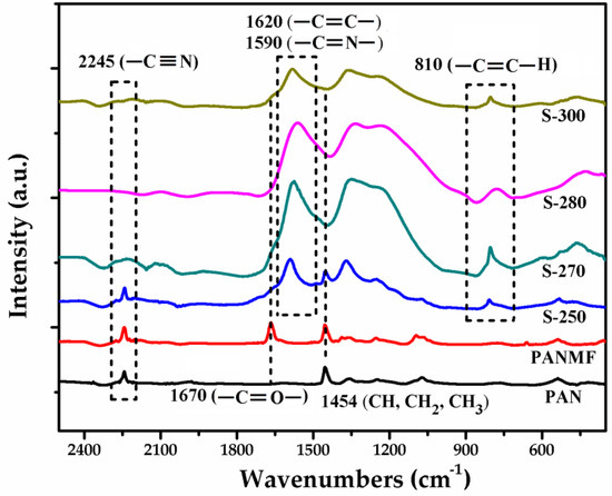 FTIR spectra of PAN, PANMF, and PANMFs stabilized at 250, 270, 280, and 300 °C.