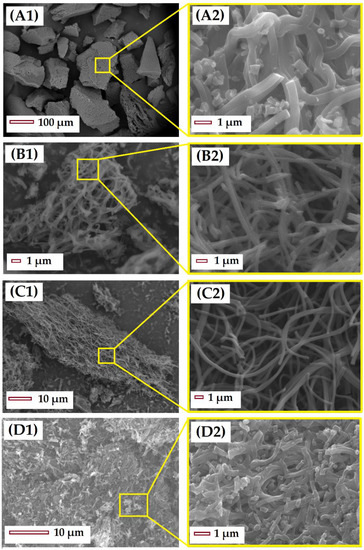 SEM images of CMF stabilized and carbonized: (A) S-250-C, (B) S-270-C, (C) S-280-C, and (D) S-300-C. The images on the right (A2, B2, C2, and D2) are zoomed in images of a region of the figures on the left (A1, B1, C1, and D1).