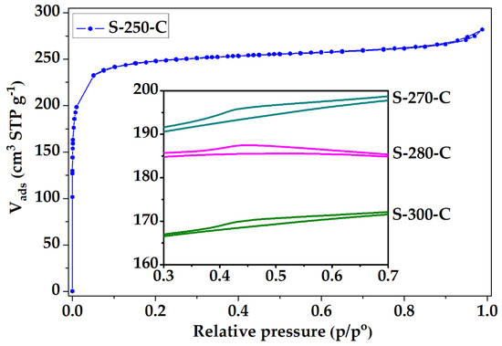 The N2 adsorption isotherm of the PANMFs stabilized at 270 °C and carbonized at 900 °C is shown in Figure 3, the isotherms of the other three materials exhibited similar behavior; however, they presented a small hysteresis cycle, which are displayed in the figure frame. Based on the IUPAC classification [43], the isotherm for material S-250-C correspond to Type I, while for materials S-270-C, S-280-C, and S-300-C the isotherm type corresponds to a combination of Type I (due to the presence of microporosity) and Type IV (due to the presence of mesoporosity), with small hysteresis cycle corresponding to Type H4, characteristic of micro-mesoporous carbon. At low relative pressures (less than 0.1 in the relative pressure interval) in all materials, nitrogen adsorption is mainly attributed to the presence of micropores. At relative pressures greater than 0.35, the materials S-270-C, S-280-C, and S-300-C present a hysteresis cycle, associated with the presence of mesopores (box at the bottom of Figure 3). While the S-250-C does not present the little loop, which implies the absence of mesopores. Therefore, to obtain a totally microporous material, a stabilization temperature of 250 °C is recommended.