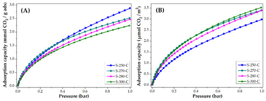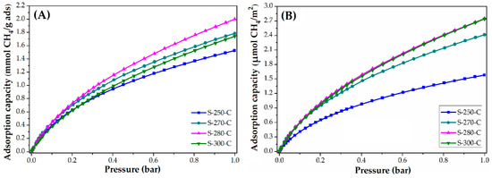 The CO2 and CH4 adsorption capacity was evaluated at 25 °C, the isotherms obtained are presented in Figure 4 and Figure 5. Figure 4 shows the adsorption isotherms in units of mmol CO2 adsorbed in one gram of adsorbent. These values are similar to the ones reported in the literature [14,15,47]. Note that the material stabilized at 250 °C adsorbs the most CO2 and the material stabilized at 300 °C adsorbs the least. To eliminate the impact of the surface area on the CO2 adsorption, the isotherms are normalized considering the BET area of each of the materials; the resulting behavior is shown in Figure 4B. The materials stabilized at 270, 280, and 300 °C adsorb similar quantities per square meter (3.4 μmol/m2, at 1 bar) that represent a greater adsorption capacity than material stabilized at 250 °C. Even though the material stabilized at 250 °C is the material with the largest surface area, it has the lowest CO2 adsorption per square meter, this may be due to the different chemical composition shown by the carbon fiber. It was shown in FTIR that this material still has nitrile groups, which can cause a lower affinity with the CO2 molecule on its surface.