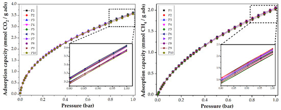 3.3. Applications: CO2 and CH4 Adsorption Capacity
