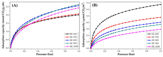 The CO2 adsorption isotherms at 25 °C of PANMF stabilized a 280 °C and carbonized at 600, 700, 800, 900, and 1000 °C are shown in Figure 7. It is observed that the increase of carbonized temperature produces an increase in the CO2 adsorption capacity. However, to observe the impact of the chemical composition of carbon microfibers on CO2 adsorption, the isotherms were normalized using the BET area, Figure 7B. The carbon microfibers decreased their CO2 adsorption capacity per square meter with the increase of carbonization temperature. This means that the increase in carbonization temperature resulted in the loss of chemical groups able to interact with CO2 but caused an increase in their BET areas. BET areas increase from 296 to 822 m2 g−1; however, the CO2 adsorption capacity does not increase proportionally to the surface area. In this way, the CO2 adsorption capacity in carbon microfiber is mainly determined by their chemical composition. For the material SC-600 and SC-700, the nitrogen species pyridinic and pyrrolic are predominant, which means these species show a greater affinity for CO2.