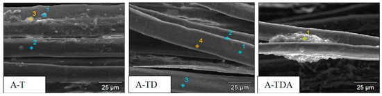 SEM images of treated fibers A-T, A-TD, and A-TDA (×1000) using the processing parameters A.