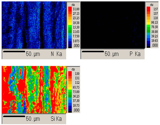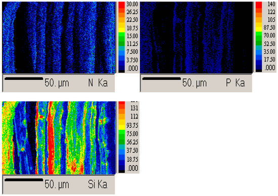 Finally, in the case of A-TDA, large aggregates are observed at ~10–20 µm. EDX analyses (results shown as Supplementary Materials) confirm that these aggregates contain Si, P, and N, demonstrating that the three precursors are involved in the formation of the coating. Residual chlorine is also detected. EPMA was also carried out (Figure 6) on the A-TDA sample and confirmed the presence of Si, P, and N on the surface of the fibers, demonstrating that the condensation of TEOS, APTES, and DEPTES has occurred. The EPMA images are color coded and clearly show the deposition of a coating at the surface of the whole fabric (blue and green part for Si); however, aggregates are noticeable (red area for Si).