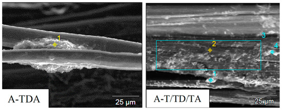 Scanning electron microscopy coupled with EDX analyses was first carried out to verify the quality and homogeneity of the deposited coatings. The images of A-T, A-TD, and A-TDA are presented in Figure 2. The numbered dots indicate the location of the chemical analyses performed. All the data are given in the Supplementary Materials and only selected ones are included in the paper to justify the conclusions.