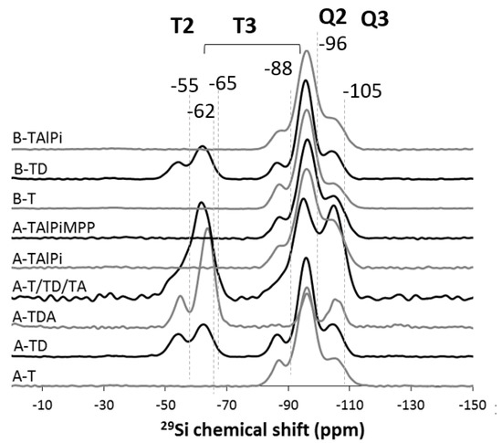 To investigate the level of condensation of the sol–gel, 29Si NMR was used. At the molecular level, solid-state 29Si NMR allows the observation of connectivity and degree of condensation in solid siliceous materials. The silicone structure can be distinguished according to bridging oxygen number per silicone–oxygen tetrahedron. Q0, Q1, Q2, Q3, and Q4 notations used in 29Si NMR spectroscopy are used for Si with four oxygens attached; the numbers 0–4 denote the number of ‘Si’ units attached through the oxygen to an individual silicon atom. Similarly, T0, T1, T2, and T3 are used for Si with three oxygens attached; the numbers 0–3 denote the number of ‘Si’ units attached through the oxygen to an individual silicon atom (see Supplementary Materials for further details) [27].