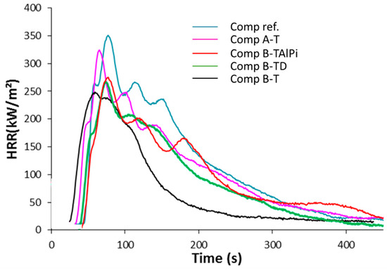 The flame spread tests were performed as screening tests, which then allow the selection of the coatings further used for the composite preparation. Composites were prepared using fabrics treated with A-T, B-T, B-TD, and B-TAlPi according to the results obtained from the flame spread test. Their FR performances were compared to the not treated reference using cone calorimeter test. The results of the cone calorimeter measurements are presented in Figure 14 and Table 3. The Figure 14 presents the different heat of release rate (HRR) curves obtained for each material, and Table 3 gives a mean value for each measurement using all the experiments performed for each composites, as well as the standard deviation associated with the measurements.