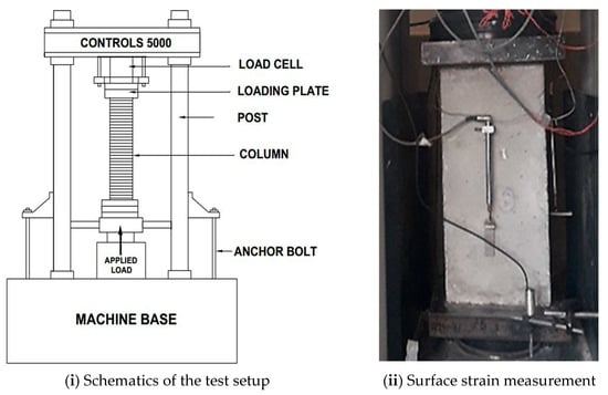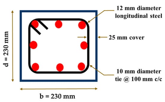 In total, 12 square short columns of cross-sectional dimension 230 mm were cast in which six specimens were plain concrete columns, and the rest of them were reinforced with standard internal steel rebars. The length of the specimen was limited to 450 mm due to constraints in test equipment. Eight bars of 12 mm diameter (As = 904 mm2) and 10 mm diameter bars at a spacing of 100 mm were used as longitudinal and tie reinforcements, respectively. The specimen details are illustrated in Figure 1, and the test matrix with the corresponding strengthening schemes are provided in Table 1.