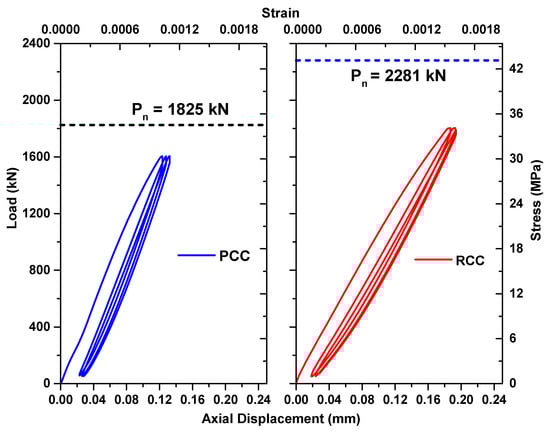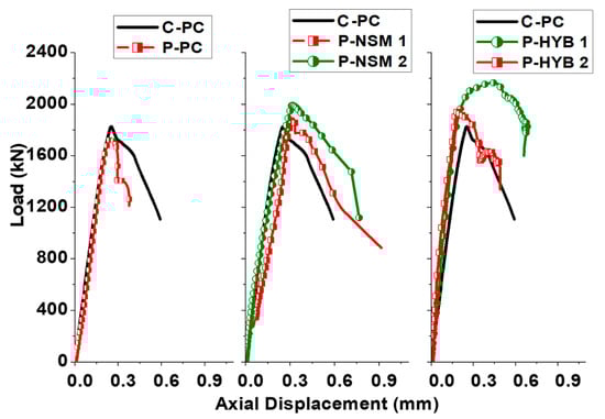 The plain concrete column (C–PC) represents the behaviour of the control column tested without any pre-damage under axial compression. The specimen had a peak load of 1825 kN corresponding to a displacement of 0.25 mm. The control plain concrete columns were pre-damaged by subjecting to a load of 1600 kN for three cycles. After cyclic pre-damage, no significant reduction in strength of the specimen was observed (Figure 5). However, a good reduction in stiffness and ultimate displacement was witnessed. From Table 3, it can be witnessed that the plain control column (P-PC) had a 14% reduction in axial stiffness. The peak load of specimen P-PC was observed as 1724 kN, which is only 6% lesser when compared to the control specimen (C-PC). The column failed at an ultimate displacement of 0.38 mm, which is about 55.3% lower than the control PC specimen.