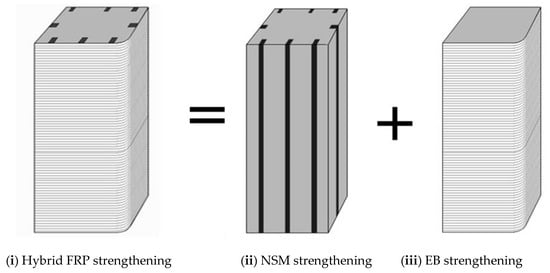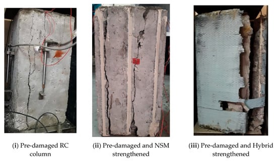 Although numerous studies in the past have focused on the strengthening of the RC (or plain concrete) members through FRP materials; only a handful of research work has focused on the strengthening of pre-damaged columns under axial compression [,,,]. Moreover, FRP strengthening and rehabilitation of concrete members with non-circular sections is still a challenging issue for researchers because of the reduced efficiency of confinement (EB) through FRP wrapping [,,]. Additionally, EB strengthening alone cannot improve the performance of columns under flexure-dominated loading [,,]. This work investigates the behaviour of hybrid strengthening using a combination of NSM CFRP strips confined by carbon FRP fabrics for improving the performance of pre-damaged columns under compression. Both plain concrete and RC columns were pre-damaged and retrofitted with only NSM technique and hybrid strengthening to understand their efficacy in the performance improvement. It is worth mentioning that no previous studies have been carried out in understanding the behaviour of pre-damaged columns strengthened using a hybrid combination of NSM and EB under axial loads and is the focus of the current study.