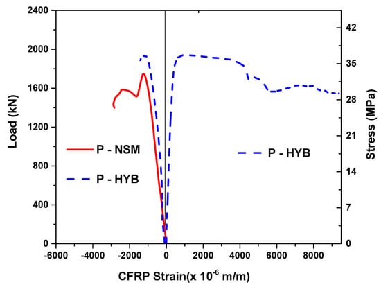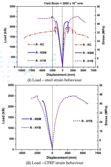 FRP strengthening was able to reduce the overall strain in the specimens when compared to damaged RC specimens (R-RC). Moreover, the hybrid strengthening was able to provide a simultaneous contribution in both longitudinal, transverse reinforcements and CFRP due to which the improvement in overall behaviour was achieved. The transverse strain contribution of CFRP is significant in the case of hybrid strengthening (Figure 6). The effective confinement of NSM laminates using CFRP fabrics helped in resisting the applied additional strain and thereby improved the overall behaviour of the specimen when compared to the only NSM strengthening Scheme.