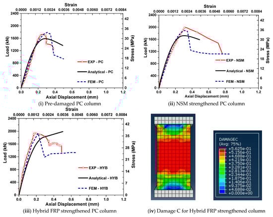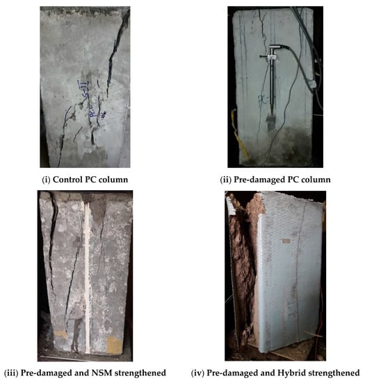 In the case of PC columns, initial cracks occurred due to tensile stresses from the Poisson effect in the lateral direction. These cracks widened further towards the corners. The failure occurred due to larger crack width formation and spalling of concrete cover (Figure 7i). The failure of NSM strengthened pre-damaged columns initiated due to cracking between the FRP laminates. The failure was sudden due to compression dominant behaviour (Figure 7iii). The column failure of hybrid pre-damaged specimens initiated due to rupture of FRP followed by propagation of rupture on the corners of the specimen. The failure occurred due to de-lamination of FRP with the cover concrete from the core in a sudden brittle manner (Figure 7iv).