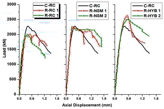 The pre-damaged RC columns, which are strengthened using the NSM technique. completely restore the initial stiffness, load carrying capacity and axial ductility when compared to the control un-damaged specimens under pure compression. The average load-carrying capacity of the specimen was found to be 2261 kN, which shows that the peak strength was fully recovered. The displacement ductility at failure was found to be 1.63, which was 8.6% higher than the control RC column (C-RC). The pre-damaged hybrid FRP strengthened RC columns had an average peak load of 2555 kN corresponding to the displacement of 0.53 mm. The hybrid RC specimen was able to increase the peak load capacity by 12% and reached the ultimate displacement up to 90% of control reinforced concrete (C-RC) column without any damage. The confinement pressure supplied by external confinement helps to close the compression cracks and enhance the confined compression strength of pre-damaged columns. The confinement of concrete core also helped the NSM laminates in hybrid specimens to undergo larger strains before failure resulting in the more effective use of the laminates when compared to only NSM strengthening.