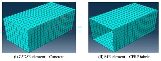 A phased three-dimensional (3D) nonlinear finite element study for pre-damaged RC columns with and without FRP techniques was carried out using a commercial finite element software ABAQUS []. The nonlinear behaviour of concrete in both tension and compression were modelled using concrete damage plasticity (CDP) model [,,]. The predictions obtained from the FE model are validated with the experimental results. The details of the FE modelling are discussed in the following sections.