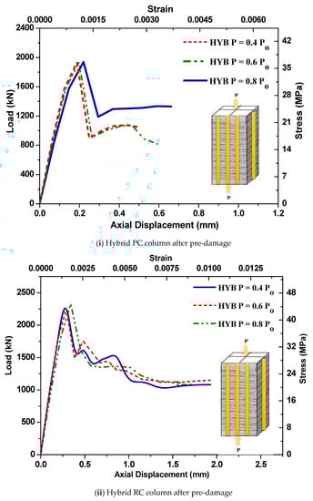 The first parametric study was performed to understand different pre-damage levels in hybrid FRP strengthening. The initial pre-damage levels in both PC and RC columns are varied as 40%, 60% and 80% of the maximum peak loads. From Figure 14, it is clear that the increase in the damage level has no significant reduction in the efficiency of hybrid FRP strengthening in terms of their compressive strength and displacement. However, for the columns with 80% pre-damage (0.8 Po), a significant reduction in the axial stiffness was observed when compared with the hybrid specimens with low pre-damage levels (0.4 Po, 0.6 Po). Moreover, the peak strength of hybrid PC and RC columns with 80% preload was slightly high compared to the low pre-damaged specimens, which show the increase in contribution from NSM laminates and confinement with the higher levels of initial damage.