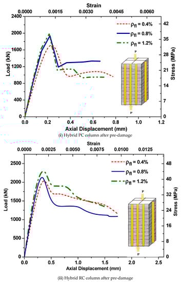 The second parametric study was to investigate the effect of FRP reinforcement ratios in the hybrid strengthening of PC and RC columns with pre-damage. For a constant FRP confinement ratio of 0.7%, the NSM laminate ratio was varied from 0.4% to 1.2%. The ratios were selected to provide optimum strengthening practices considering the levels of additional reinforcements required from external FRP strengthening. From Figure 15, it is clear that the increase in NSM laminate ratio improved the peak strength for both PC and RC hybrid columns with 80% pre-damage. However, when the FRP laminate ratio (ρfl) was increased more than 1.2%, no significant improvement in strength was observed.