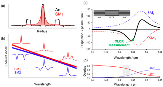 The RIP incorporated a single-mode central core surrounded by a broad high-index ring. By properly tailoring the thicknesses and refractive indices of the fiber, electromagnetic coupling between the fundamental modes of the two isolated cores yielded two supermodes with bent effective index curves around the phase-matching wavelength, as shown by numerical simulation in Figure 1b. As dispersion is related to the second derivative of the effective index versus wavelength, these two supermodes, labelled SM1 and SM2, exhibited large second-order dispersion with opposite signs (see Figure 1c, dashed lines). As this fiber is inherently bimode, the overall behavior depends on the weights of the super-modes, which depend on the launching conditions [24,25]. In the following, we considered that light was launched into and collected from the central core of the DCCF by means of standard single-mode fibers (SMF) according to the schematic shown in inset to Figure 1c. Under these conditions, light was preferentially launched into SM1 at short wavelengths, while SM2 was predominantly excited at long wavelengths (see spatial distributions of light in both modes in insets to Figure 1b).