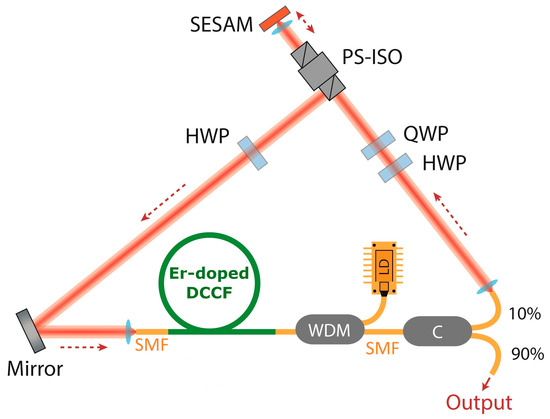 To better understand the pulse dynamics along this cavity, we numerically investigated this system using the standard split-step method with the cavity elements arrangement provided in Figure 2. Pulse propagation along the gain fiber was described by the extended nonlinear Schrödinger equation (NLSE), including second- and third-order dispersion terms, Kerr nonlinearity, and saturated gain with a finite bandwidth of 30 nm around 1530 nm [6,12,28,29]. Propagation along the fibers was assumed to be single-mode, and only the dispersion and nonlinearity parameters inferred from their structures were considered. The linear and nonlinear parameters of the intracavity fibers are summarized in Table 1. The action of the mode-locking mechanism was modeled by a high-contrast effective saturable absorption effect with an instantaneous response [6]. We used the well-known transmission equation given by [28]: