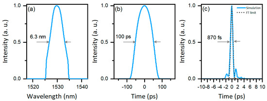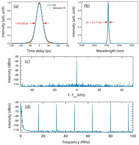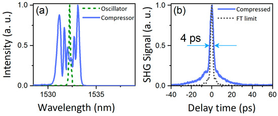 The output pulses were then nonlinearly compressed through the extra-cavity stage introduced in Part 2. The dispersion of the DSF was about −2 ps/nm/km at 1530 nm. The spectrum and alternating current (AC) trace of the nonlinearly compressed pulses are depicted in Figure 4.