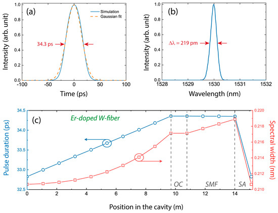 The evolution of the pulse parameters inside the cavity shows that the pulse dynamics were dominated by the interplay between the high dispersion of the gain fiber and the saturable absorption mechanism, as shown in Figure 5. The temporal lengthening endured within the gain fiber was completely compensated by the saturable absorber effect. We note that the spectral broadening along the cavity was moderate at this energy level, indicating a quasi-linear propagation regime. The simulated pulse characteristics are shown in Figure 5, with a spectrum of 220 pm FWHM and pulse duration of 34.3 ps, which are comparable with the experimental measurements.
