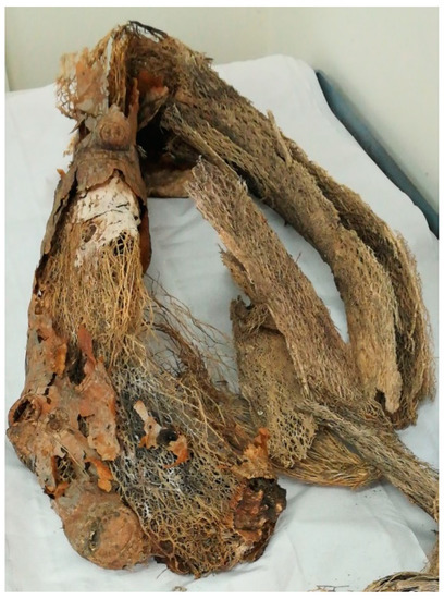 The fibers used for the study were available after long storage at Agenzia nazionale per le nuove tecnologie, l’energia e lo sviluppo economico sostenibile (ENEA), in Anguillara, Italy, originating from some Opuntia plants, which were cut for garden area maintenance on the site. An example of the waste material as-received is depicted in Figure 1. To obtain the fibers, the material obtained was first cleaned with compressed air and brush, after which they were washed and brushed, then cut in small pieces, in the order of 20 mm or so. After this, they were sonicated in distilled water for 30 min, then dried in an oven at 70 °C for 24 h and finally mashed in ball mill for 2 h. The final sizes of the fibers obtained were not higher than 1 mm in length, and with very variable aspect ratios, from close to 1, therefore in powder form, to others with up to 10–20.