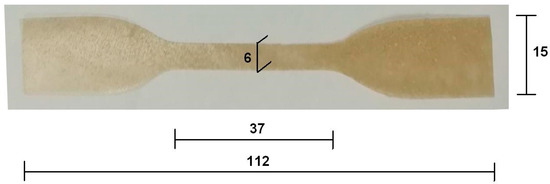 Figure 2. Example of a tensile dog-bone specimen (quotes in mm with tolerance ± 0.1 mm). - Differential scanning calorimetry (DSC) to evaluate the evolution of films and composites behavior with temperature by heating at a rate of 10 °C/min, from 25 to 180 °C, using a Mettler Toledo HPDSC system.