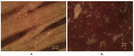 To produce the composites, the use of nopal dry fibers to fill them was investigated; their aspect as received is represented in Figure 3a. The fibers were received as complex aggregates of fibrils only partly separated. This would affect the adhesion force of a polymer on it. It was therefore suggested that the fibers would be better ground to a much smaller maximum size in the order of a millimeter or less. It needs to be highlighted, nonetheless, that in this way, proceeding to size reduction via the use of a ball mill, some powder is also obtained, as reported above in Section 2.1. The fibrous material after grinding is depicted in Figure 3b, where its whitish aspect is contrasted against a dark background.