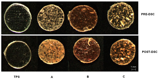 Samples of TPS and TPS–dry-nopal composites (type A, B and C, respectively) pre- and post-differential scanning calorimetry (DSC) analysis.