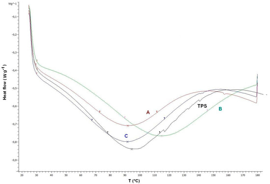 DSC curves for TPS and the three composites with dry nopal fibers (type A, B and C, respectively).