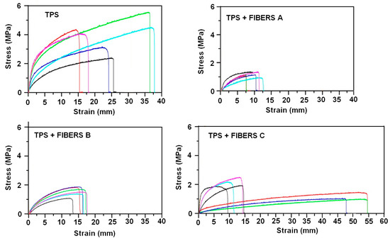 Tensile curves of thermoplastic starch (TPS) and its composites with dry nopal fibers (colors represent the curves for the different samples tested).