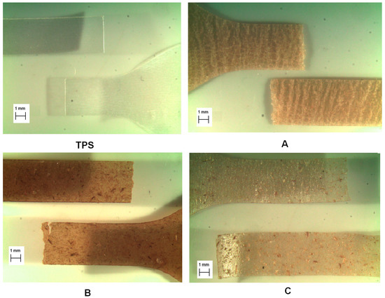 Tensile fractured samples of pure TPS and TPS–dry nopal fiber composites (type A, B and C, respectively).
