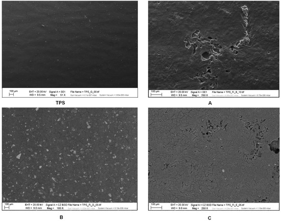 SEM images of thermoplastic starch (TPS) and its composites with dry nopal fibers (type A, B and C, respectively).