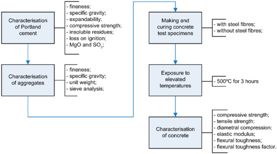 Figure 1 shows the flowchart of the experimental procedure utilized for the characterization of Portland cement and its aggregates. In this study, concrete specimens with and without steel fibers were prepared. Table 1, Table 2 and Table 3 list the characteristics of the cement, fibers, and raw materials, respectively; Table 4 specifies the proportions of the raw materials; and Table 5 describes the chemical composition of the fibers.