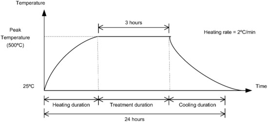 The concrete specimens without fibers will be further referred to as control concrete (CC), and the steel fiber-reinforced concrete (SFRC) specimens were found to be dependent on the AR of their fiber components. Four prismatic specimens with dimensions of 150 × 150 × 500 mm and 20 cylindrical specimens with diameters of 100 mm and heights of 200 mm were molded. A half of the prepared specimens were heated to a high temperature after 7 d of 28 d humid curing in accordance with the diagram presented in Figure 2.