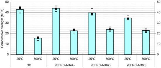 Figure 4 shows the results of compressive strength testing of the concrete specimens obtained before and after heating. The SFRC-AR44_25 °C sample exhibited a slightly higher strength than that of CC_25 °C (by approximately 3%). The compressive strength was not significantly reduced due to the addition of fibers. Strength reductions were on the order of 7% and 19% respectively for SFRC-AR60_25 °C and SFRC-AR80_25 °C. Several parameters can change the compressive strength of the material, such as load application speed, environmental conditions, curing and capping methods, which can generate a value distinction of 20%, thus demonstrating that the addition of fibers does not generate significant changes in compressive strength [66,67,68]. It is generally assumed that the reduction in the SFRC compression strength with an increase in the fiber AR before heating is related to the loss of concrete workability in the fresh state due to the fiber insertion and increase in the fiber length [8]. The strengths of the SFRC-AR44_500 °C, SFRC-AR67_500 °C, and SFRC-AR800_500 °C specimens exceeded that of CC_500 °C by approximately 45%, 53%, and 46%, respectively. A comparison of the compressive strengths obtained for the non-heated and heated concrete samples showed that their magnitudes were significantly reduced; however, the residual compressive strengths of the steel fiber-reinforced concretes were higher than the values obtained for the non-fibrous ones. Thus, the strength of the CC_500 °C specimen was equal to 36.5% of the magnitude measured for CC_25 °C, whereas the SFRC-AR44_500 °C, SFRC-AR67_500 °C, and SFRC-AR80_500 °C samples had residual compressive strengths equal to 52%, 60%, and 65% of the values obtained for the respective unheated (25 °C) reinforced concretes, indicating that loss reduction occurred with an increase in the AR of the reinforcement fibers. Although the obtained residual mechanical strengths were very close, and the AR of the fibers did not apparently influence the measurement results obtained for the heated samples, the workability loss in the fresh state with increasing fiber length and related reduction in the compressive strength [8] were effectively eliminated. Since the residual mechanical properties of the hot material do not differ significantly in the temperature range of 200–600 °C [69], the prepared SFRC possesses better abilities to endure exposures to a temperature of 500 °C as compared to those of ordinary concrete.