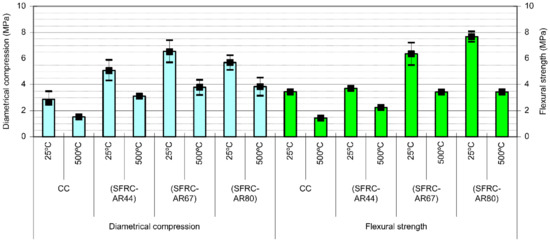 Figure 5 shows the results of diametral compression and flexural strength testing. They show that the addition of steel fibers to concrete significantly increases its flexural strength, which becomes further improved with increasing AR [70]. The diametral compression strengths of the SFRC-AR44_25 °C, SFRC-AR67_25 °C, and SFRC-AR80_25 °C specimens were greater than that of CC_25 °C by 77%, 128%, and 98%, respectively. Further, the flexural strengths of the SFRC-AR44_25 °C, SFRC-AR67_25 °C, and SFRC-AR80_25 °C samples were 8%, 85%, and 123% higher than that of CC_25 °C, respectively. However, the SFRC-AR44_500 °C, SFRC-AR67_500 °C, and SFRC-AR80_500 °C specimens demonstrated diametral compression strengths that were approximately 105%, 149%, and 154% greater than that of CC_500 °C and flexural strengths that were approximately 56%, 216%, and 208% higher than that of CC_500 °C, respectively. The residual diametral compression strength of the CC_500 °C sample was equal to 53% of that of CC_25 °C, and the residual diametrical compression strengths of the SFRC-AR44_500 °C, SFRC-AR67_500 °C, and SFRC-AR80_500 °C specimens were equal to 61%, 58%, and 68% of the strengths of their respective unheated concretes (25 °C). Furthermore, the residual flexural strengths of the heated (500 °C) concretes were equal to 42%, 61%, 54%, and 45% of the corresponding magnitudes measured for the unheated concretes, respectively. The obtained results indicate that SFRC possesses higher flexural and diametral compression strengths than those of non-fibrous concrete before and after heating, and that their values increase with increasing fiber length (except for the SFRC-80 specimen in the diametral compression strength). Another important advantage of SFRC is that its flexural and diametral compression strengths are equal to or higher than those of non-fibrous concrete, indicating that at temperatures as high as 500 °C (caused by fire), SFRC would retain its ability to endure mechanical loads that could be sustained by the fiberless concrete before the fire, thus contributing to the safety of the fabricated structures.