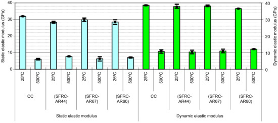 Figure 6 shows the static and dynamic elastic moduli measured for the non-fibrous and fiber-reinforced concrete, indicating the absence of any significant differences between the values obtained for the concrete specimens exposed to the same temperatures. According to the results of previous studies, the elastic modulus of the fiber-reinforced concrete increases until the AR of the steel fibers reaches 50 (AR 50) and then starts gradually decreasing after exceeding this value [71]. In this work, a similar effect was observed for the AR of 44 (AR 44), which was very close to that of the AR 50 specimen; however, no significant effect of the AR on the dynamic elastic modulus was detected. The reductions in the elastic moduli of the studied samples observed after their heating to 500 °C were very close.
