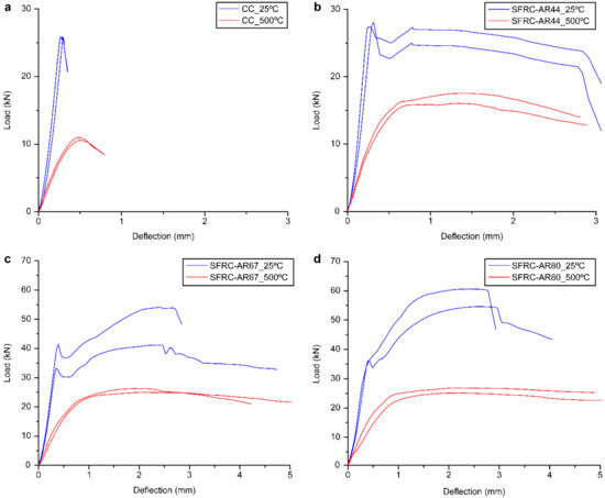 Figure 7 shows the load–deflection curves recorded during the flexural testing of the prismatic 150 × 150 × 500 mm concrete specimens. The CC samples exhibited typical brittle behavior, while the SFRC specimens demonstrated pseudo-ductile behavior by retaining their residual strengths after a first crack was produced by the applied force. The addition of fibers increased the value of the load required to create a first crack in the studied specimen. Although the higher fiber AR may decrease the values of the compressive strength and elastic modulus, it also increases the toughness and peak strain of SFRC, which lead to the absorption of a greater amount of energy and better crack control properties [72]. All the studied concrete specimens exhibited a loss of the load capacity after fire; however, its magnitudes obtained for the reinforced concrete specimens were significantly smaller. The SFRC-AR67_500 °C and SFRC-AR80_500 °C samples exhibited maximum loads that were equal to or higher than that of CC_25 °C, indicating that the SFRC specimens with fibers AR 67 and 80 retained their flexural strengths after heating at the levels equivalent to the value obtained for the non-fibrous concrete before heating. However, the data presented in Figure 7 confirm that these SFRC samples also preserved the ability to sustain high loads after reaching maximum loading during long-term deflections.