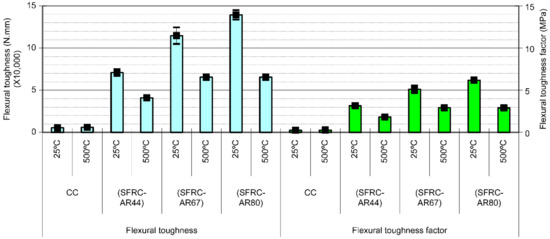 Figure 8 shows the magnitudes of flexural toughness and the flexural toughness factor obtained for the non-fibrous and fiber-reinforced concrete specimens, which increased with increasing AR. However, the flexural toughness of the CC specimen was relatively small. The flexural toughness values obtained for the SFRC-AR44 and SFRC-AR67 samples after heating to 500 °C were approximately 57% of the magnitudes measured before heating (for FRC80, this parameter was equal to 46%). Thus, the ability to retain high residual compressive strengths (Figure 4), residual flexural strengths (Figure 5), and residual tenacities (Figure 8) after heating makes SFRC a safer material with enhanced fire properties as compared to those of CC.