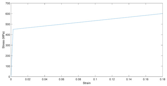 Longitudinal reinforcement of 16 mm diameter was used in all reinforced beams. The steel grade is 42 according to the Ecuadorian INEN standard 2167 [56], which means that the characteristic yield strength is 420 MPa. To determine the properties, tensile tests were carried out on three samples of the reinforcing steel by an external laboratory. The results of these tests are provided in Table 5 and an estimated simplified stress–strain diagram is shown in Figure 3.