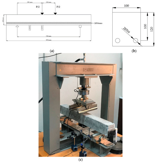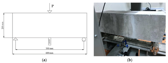 Figure 6 shows a sketch, the cross section and a photograph of the test setup. A four-point bending test was carried out. The resulting shear span to depth ratio (a/d) was 2.85, for which a shear failure is expected. The loading plate size is 260 mm × 150 mm. The beam is supported by rollers with a length of 300 mm and a diameter of 40 mm. The width of the contact surface can be estimated as 10 mm. The load is applied in a displacement-controlled manner with a speed of 0.006 mm/s until failure. For each experiment, two LVDTs are used to measure displacements: one under the load and the second one between the load and the support (in the shear span). Additionally, a camera is used for future analysis of the photographs with digital image correlation (DIC).