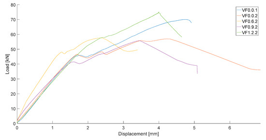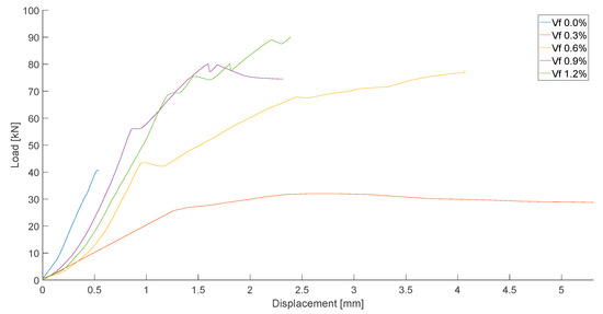 For a fiber percentage of 1.2%, which is associated with a fiber factor of 0.96, we observe a change from a shear failure to a shear-flexural failure. This effect is seen in specimen VF1.2.2: during testing, the flexural cracks are visible and opening, and at failure, some signs of crushing of the concrete are seen as well. The observed cracks are not visible in the other tests, for which the failure load is equal to or larger than the failure load in VF1.2.2 (i.e., VF0.0.1 and VF0.6.1) as shown in Figure 8.