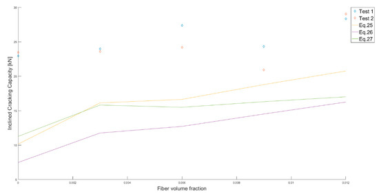 Inclined cracking capacity vs. fiber volume fraction, measurements and predictions.