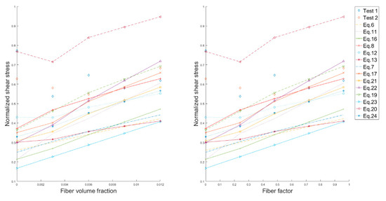 Normalized shear stress for ultimate shear capacity vs. fiber volume fraction and vs. fiber factor, predictions and measurements.
