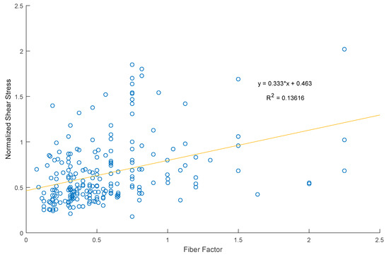 A database [14] available in the literature collected the information of 488 experiments of SFRC beams failing in shear. Trends presented in this database show that the normalized shear stress increases with the fiber volume fraction or the fiber factor. This observation differs from what we observed in our experiments, since it seems that fibers do not have an influence on the ultimate shear stress when arching action is developed. When analyzing only the specimens with small a/d ratio (less than 3.0) from the database, a similar trend is observed: the higher the fiber factor or fiber content, the higher the normalized ultimate shear stress. Nonetheless, the regression analysis results in a R2 value of 0.1363, which show that the influence of fibers is not very representative as shown in Figure 12. The presence of fibers has an influence on this parameter which is different from the results of our experimental program. However, our experiments follow this trend when the inclined cracking load is considered. These observations further underline the need for a better understanding of the mechanics of the different shear-carrying contributions in SFRC, so that recommendations for fiber contents can be based on sound mechanical concepts.