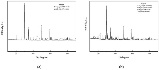 The XRD patterns of the raw oxide mixtures after sintering at a temperature of 1250 °C are in Figure 1a, shows the presence of the initial oxides only. This can possibly be a result of using powders of rather large sizes, which was done so that the chemical reactions of the silicates’ syntheses did not go to completion. However, this fact may not be essential since the raw oxide charges were yet to be melted in the internal crystallization method (ICM) process. Increasing the temperature to 1650 °C (Figure 1b) leads to the appearance of the silicate, but the initial oxides are still present.